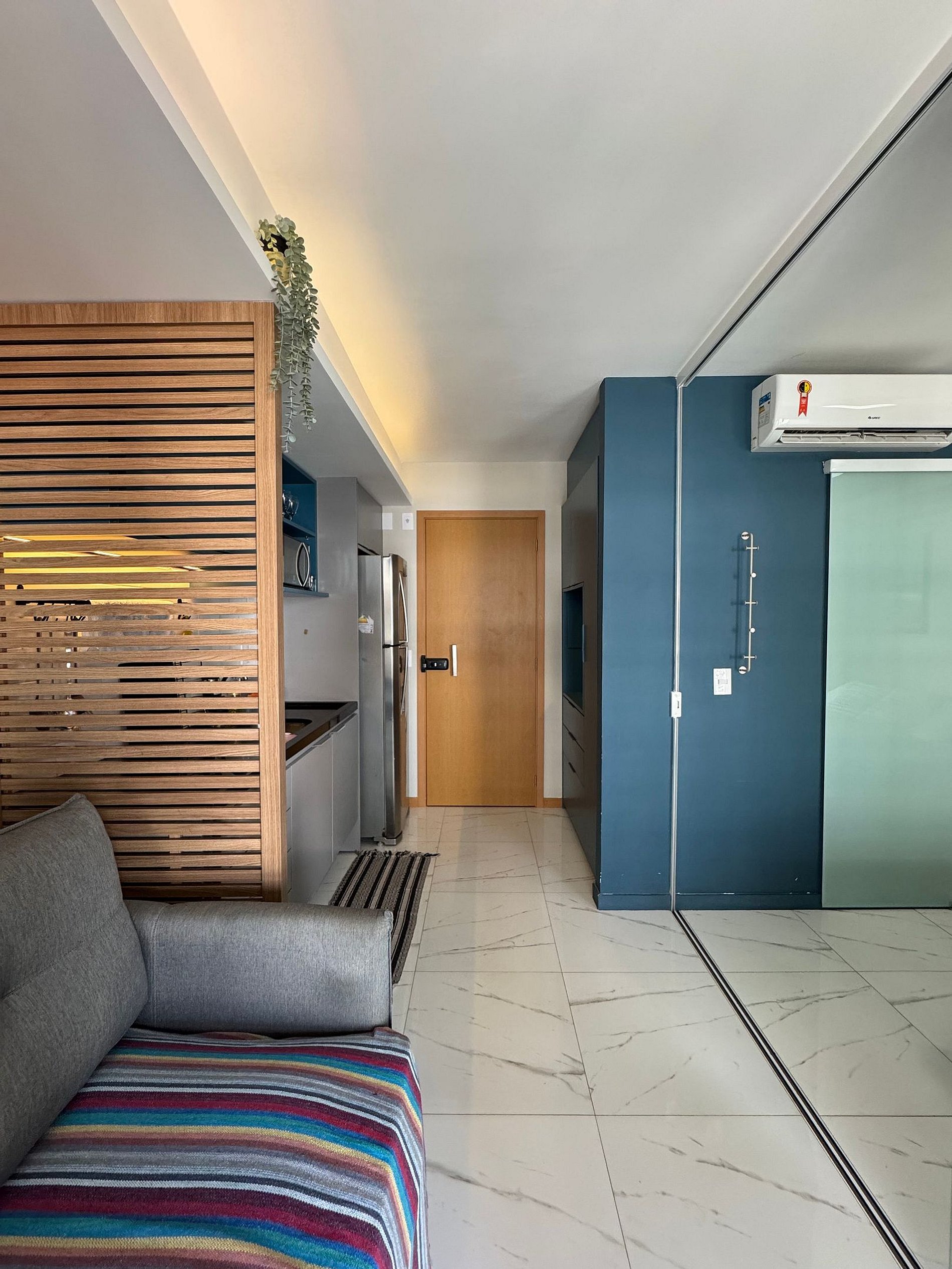 O apartamento fica climatizado com ar condicionado, alem de ser bastante ventilado com sua varanda.