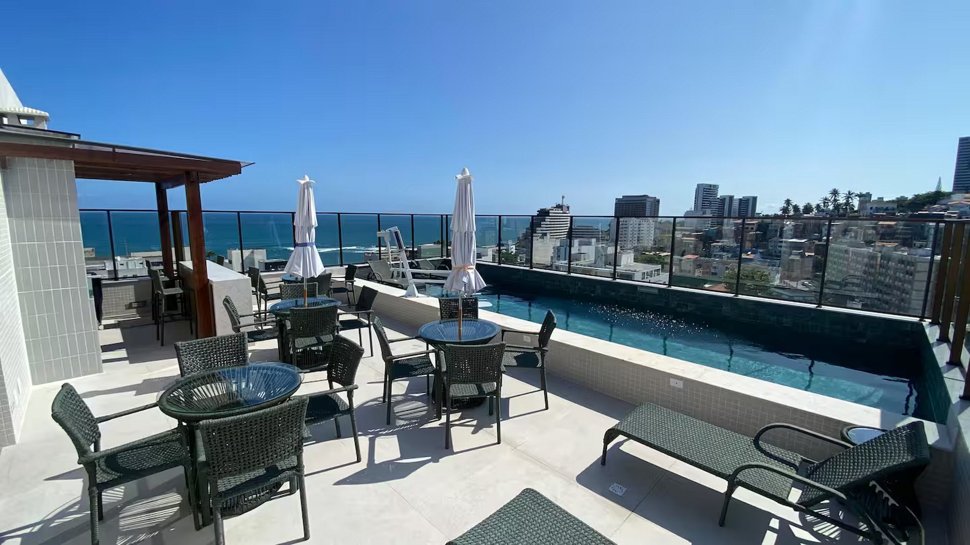 Este moderno apartramento oferece ambientes sofisticados, com vista parcial para o mar e para a cidade, cama de casal, ar-condicionado, Smart TV, sofá-cama e cama auxiliar. Cozinha completa e área de jantar. A apenas 290 metros da praia, você estará perto de tudo que Salvador oferece, como restaurantes e mercados. Aproveite a piscina na cobertura e a academia para uma estadia inesquecível.
